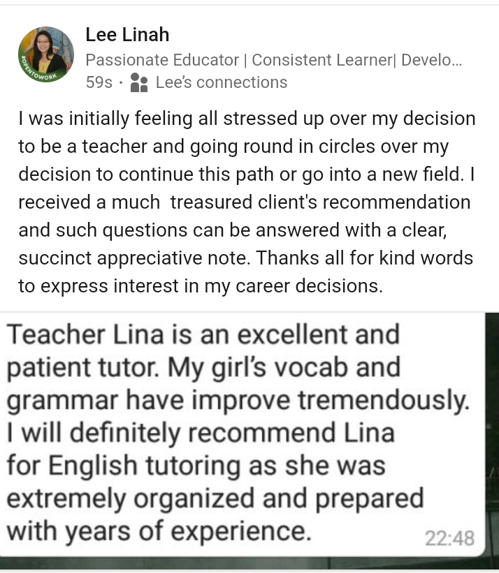 It is good to receive words from appreciative client’s regarding my decision to become a teacher. I was initially feeling all stressed up over my decision to become a teacher straight after University. Glad that decision paid off many years down the road. Wrote a Linkedin post to share the fruit of my labour.