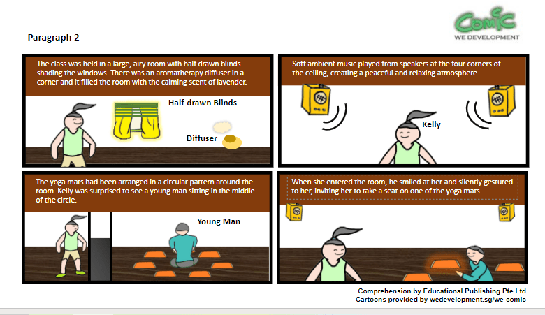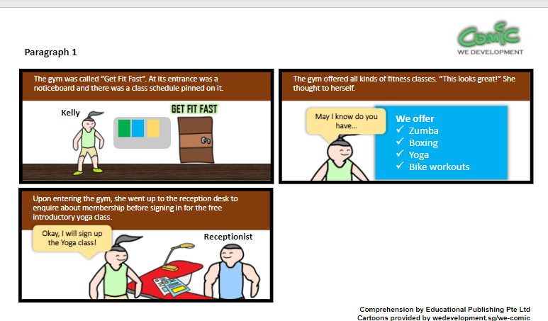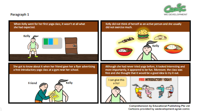Sometimes, learners can get confused with locating the right answer as they may read the second frame. This is where the sentence “Kelly did not think of herself as an active person and she usually did not exercise much” can be incorrectly identified as the answer. The question requires one to answer why she decided to “act” rather than what Kelly thought. Thus, it is good to use the comics to refer back to the question requiring us to locate the right contextual clue that answers the question more appropriately.
