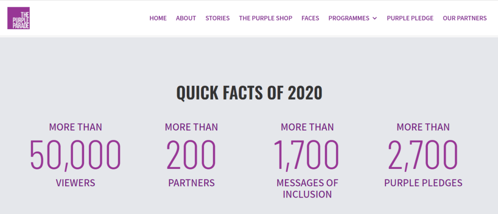 Fast forward to the present with Covid-19, the team had to pivot to other means to continue The Purple Parade movement. They stayed the course with strong supporters and their online Going Purple campaigns and concert stayed strong. Even when the committee does not have the bandwidth to personally engage everyone, thousands have continued to support the cause and sportingly joined in. This year, more than 20 000 are expected to join them. “Let’s All Go Purple” campaign in October was a great success. They have introduced Purple Conversations and Digital Human Libraries to share the life stories of persons with disabilities.