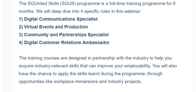 Still, I continued to sign up for course previews after previews and have a better understanding of the nature of the programmes and scrutinize all the terms and conditions every time they have the session. Through it all, I felt that the training school is putting workers welfare at heart precisely because of the pandemic. Furthermore, with the labour climate being volatile I could see that they are giving all the financial and skills support they can to workers who want to “help” themselves upskill for 6 months.