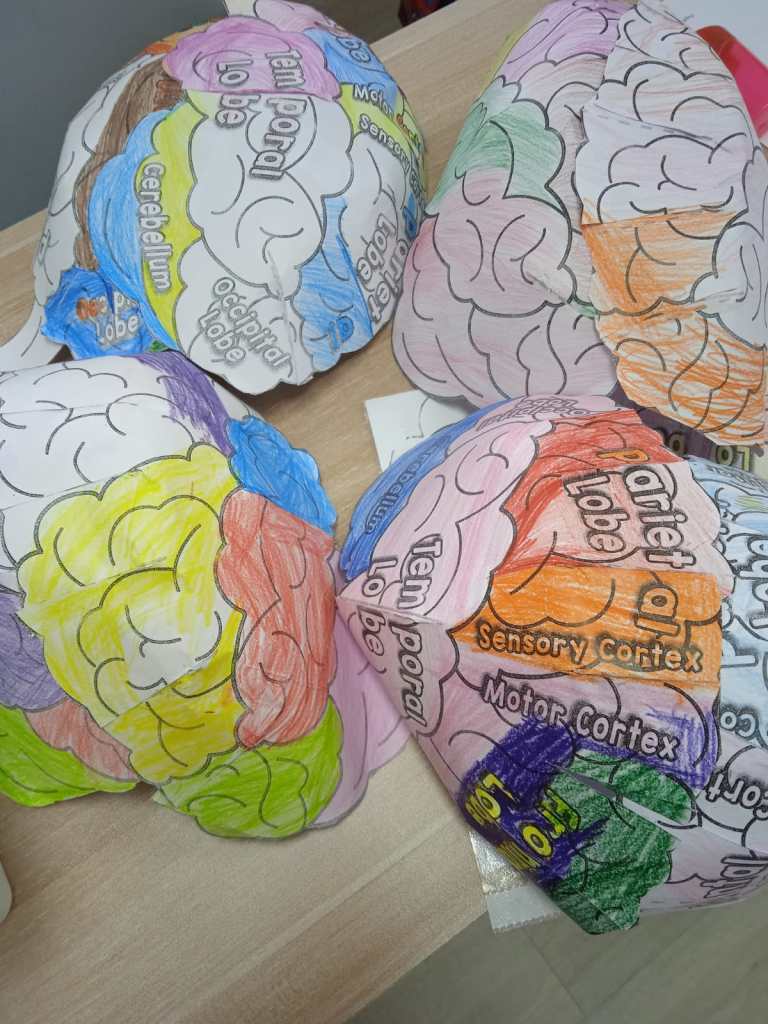 I taught my students how to make fantastic Brain Hats. The brain hat consists of the left and right hemisphere. The left and right hemisphere will have to be connected together in order to form a complete functional brain. I liked how colourful the brain hats look. There are hats with labels on parts of the brain like temporal lobe, cerebellum and brain stem.