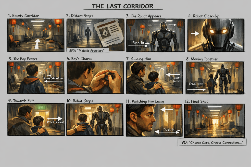 - Care vs Systems: The contrast between persuading the boy and the robot sweeping the centre mirrors the tension between human connection and impersonal institutions.